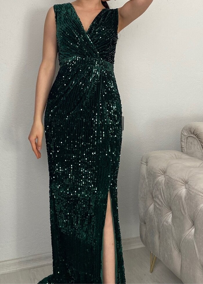 Kızlar bu daha çok bacak boyunu öne çıkarmak isteyenler için ideal bir yırtmaç boyu mevcut çok kaliteli tok bir kumaşı var fiziği çok güzel gösteriyor şık bir parça rengi duruşu yakın ve güzel günlere göre bir kere giydim hiçbir hatası vs yok payetleri güzel işlenmiş çoğu payetli elbiseye göre az dökülme yaptı