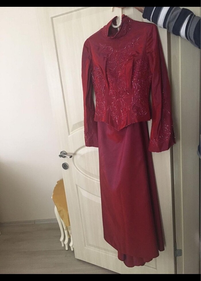 Sadece bir kere kullanıldı,etek boyu ön:114 etek arka boy 125,50 kilo ve 1.70 boy ike giydim,38 bedendir,vişne çürüğü rengindedir,eşarbı ve eşerp süsü içindedir