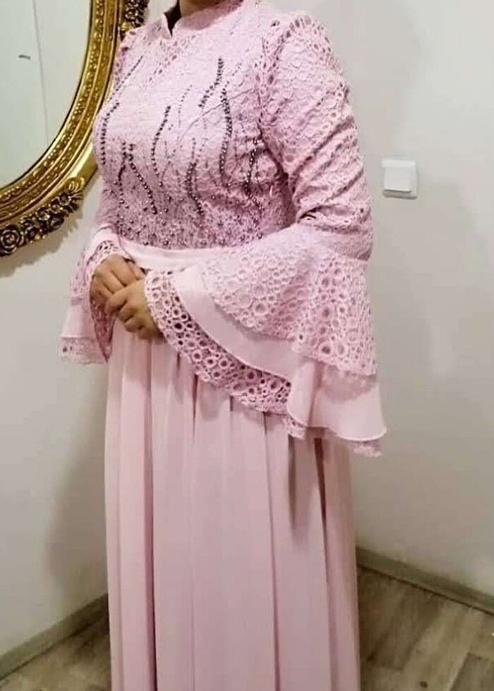 bir kere kullandım. etek boyu 103cm kol boyu 60 cm. arkadan ve yan kısımdan fermuarlıdır. içinde astarı vardır dar geldiği için satmak istiyorum, kemer kısmında kalem izi var.etek kısmında leke bulunuyor kuru temizlemeyle temizlenir.