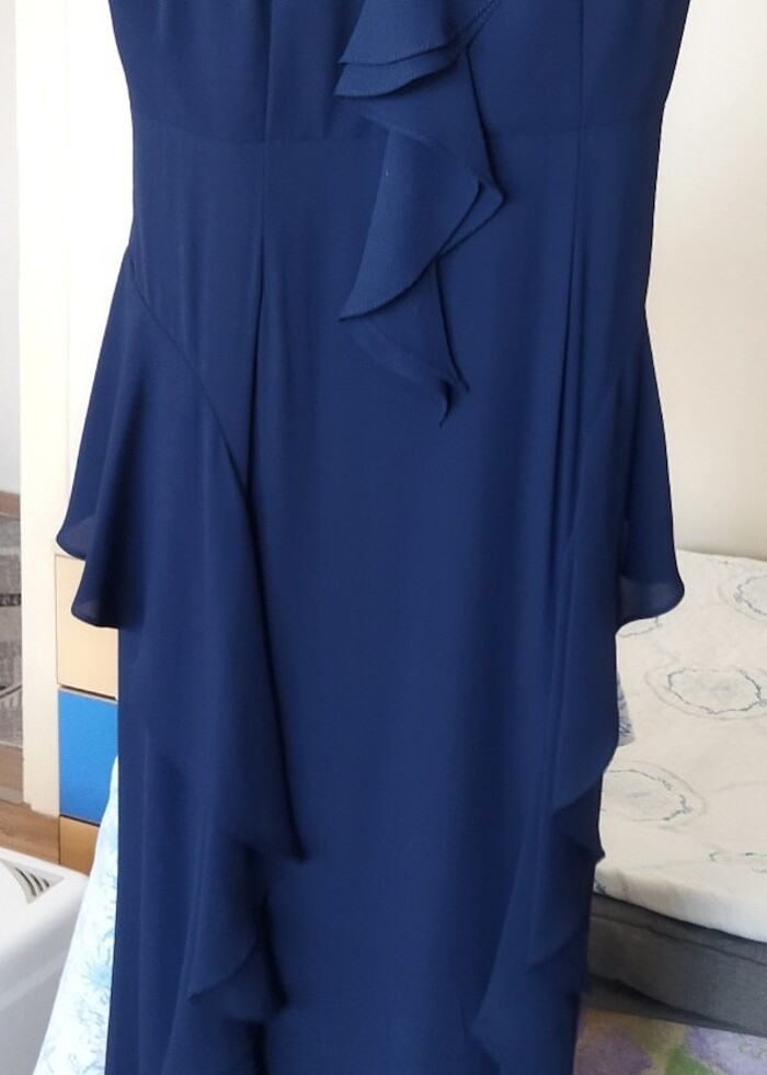*Farklı kamera çekimi dolayısıyla renk farklı görünmektedir, ürün laciverttir.* Uzun,askılı , fırfır detaylı hareketli bir elbise. Gece, mezuniyet, balo ,nişan,düğün her yere uygundur.