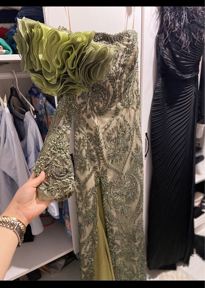 Ürünü sadece bir kez giydim ön kısmındaki Gül detayı çıkarılabilir yırtmaçlı 62 kiloyum 1.63 boy tam oluyor eteki kısmı bir tık Uzun kolu transparan çok şık alana şimdiden hayırlı olsun uğur getirsin