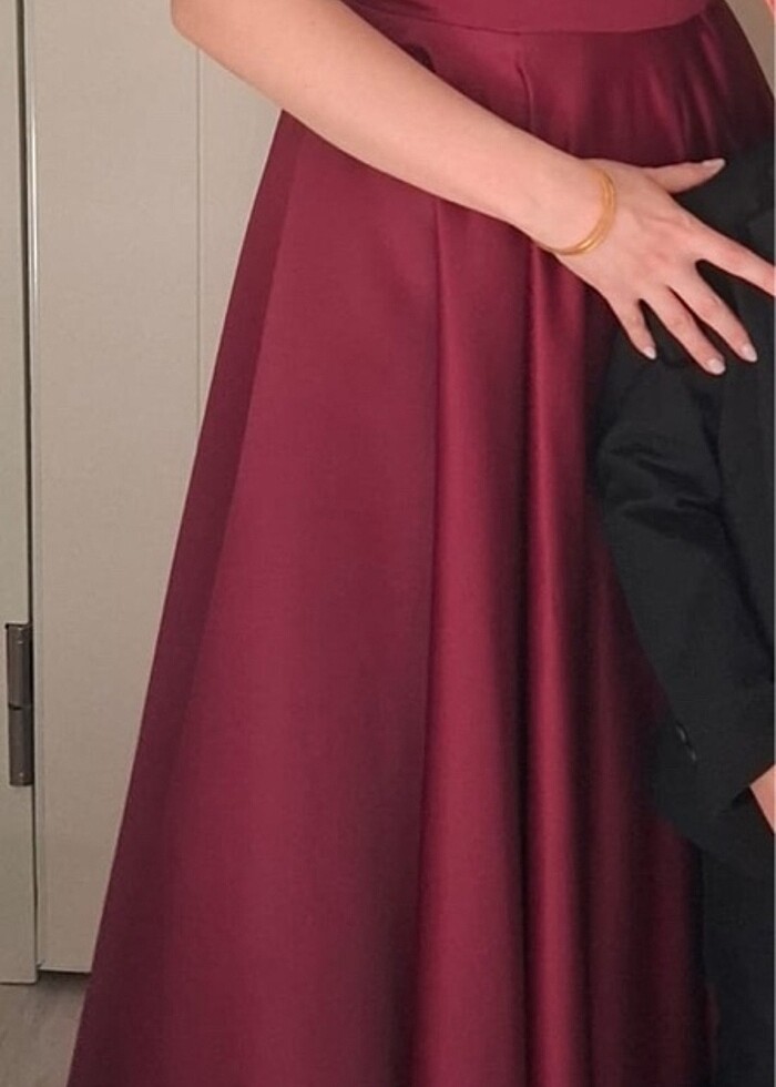 Sadece birkaç saat giyilmiştir.İster askılı ister askısız kullanılabilir.Vişne rengi Cepli volanlı midi boy elbise.