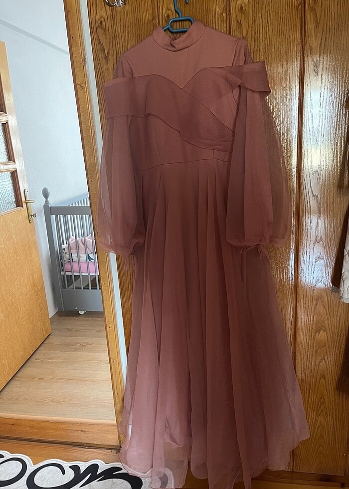 Sadece 1 defa giyildi üstü tül abiye bedeni 42 yazıyor ama 38 ve 40 beden olur benim bedenim normalde 38 dir rengi son fotoğraftaki gibidir