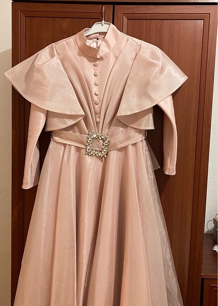 Bir kere giyildi düğünde toz pembe kumaşı kendinden simli parlak muhteşem bir kumaş iki göğüs arası 40 cm İki kol arası 33 Boy 133 cm
