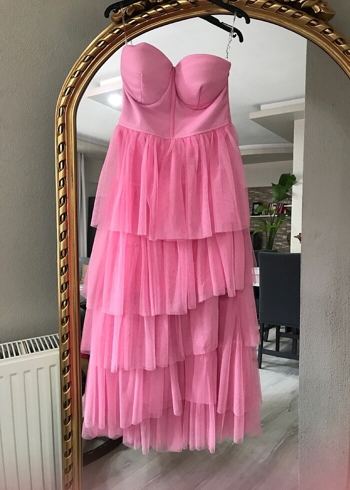 Pembe abiye alttan kat kat fırfırlı s ve m beden uyumlu dekolte sıtraplez yandan fermuarlı