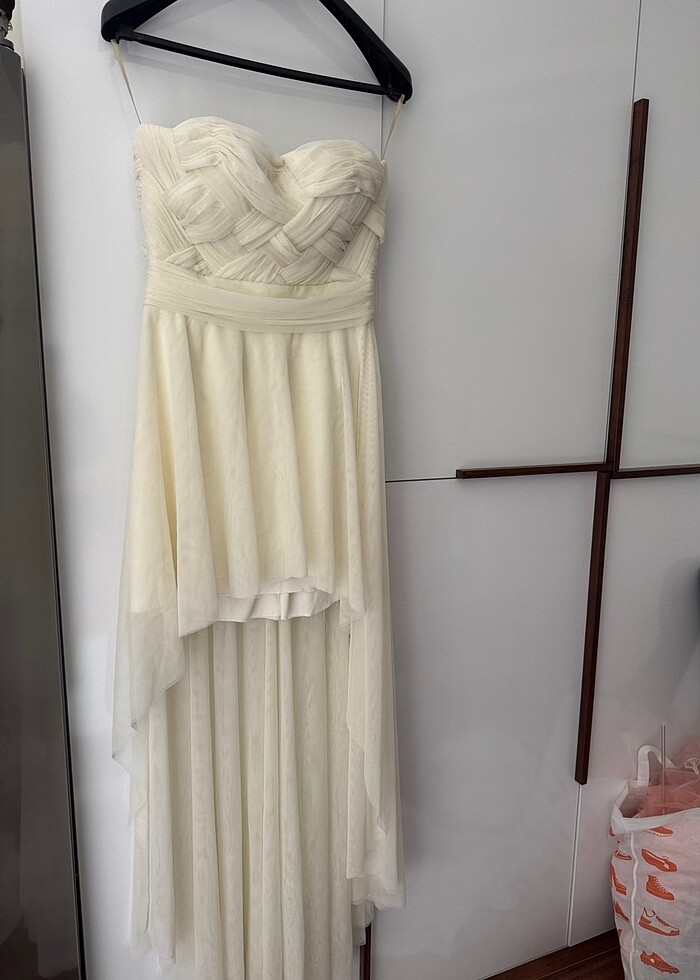 Önü kısa arkası uzun straplez yaka bir model krem rengi