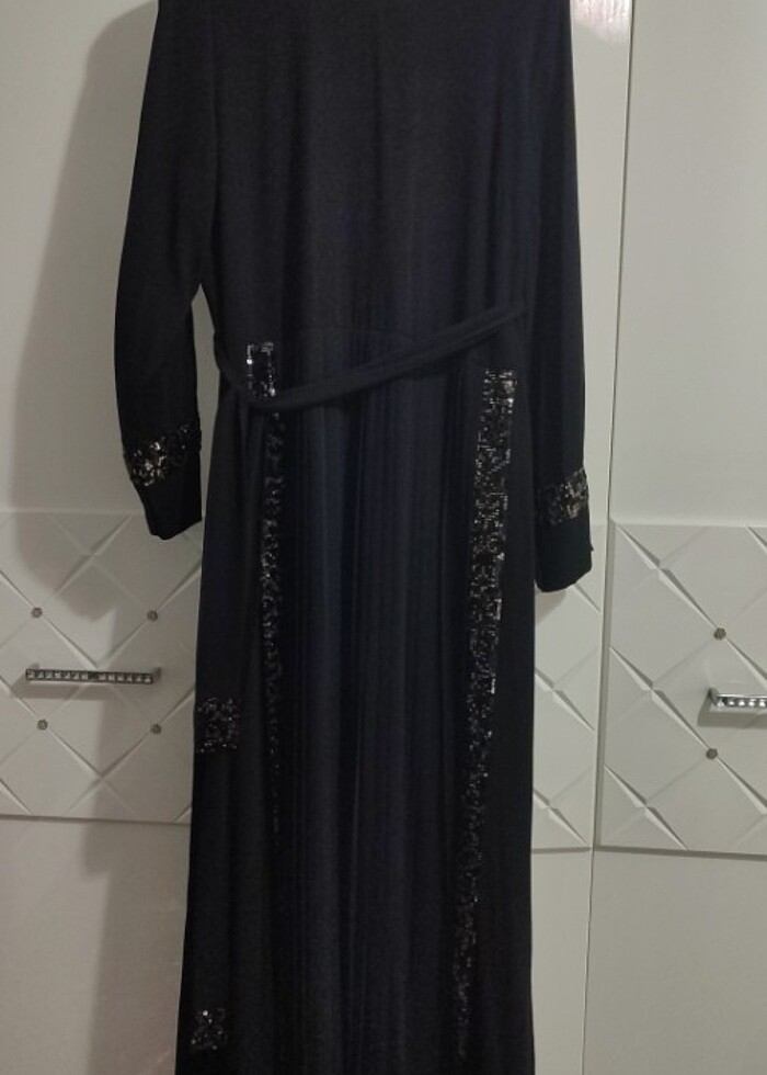 Çok şık bir düğün özel gün elbisesi. Sadece bir kez kınada giyildi.Çok severek giydim ama kilo aldığım için giyemiyorum. Üzerinde 48 yazıyor ama 44-46 bedenlere uyar. Göğüs 51 bel 44 cm dir. Boyu omuzdan 142 cm