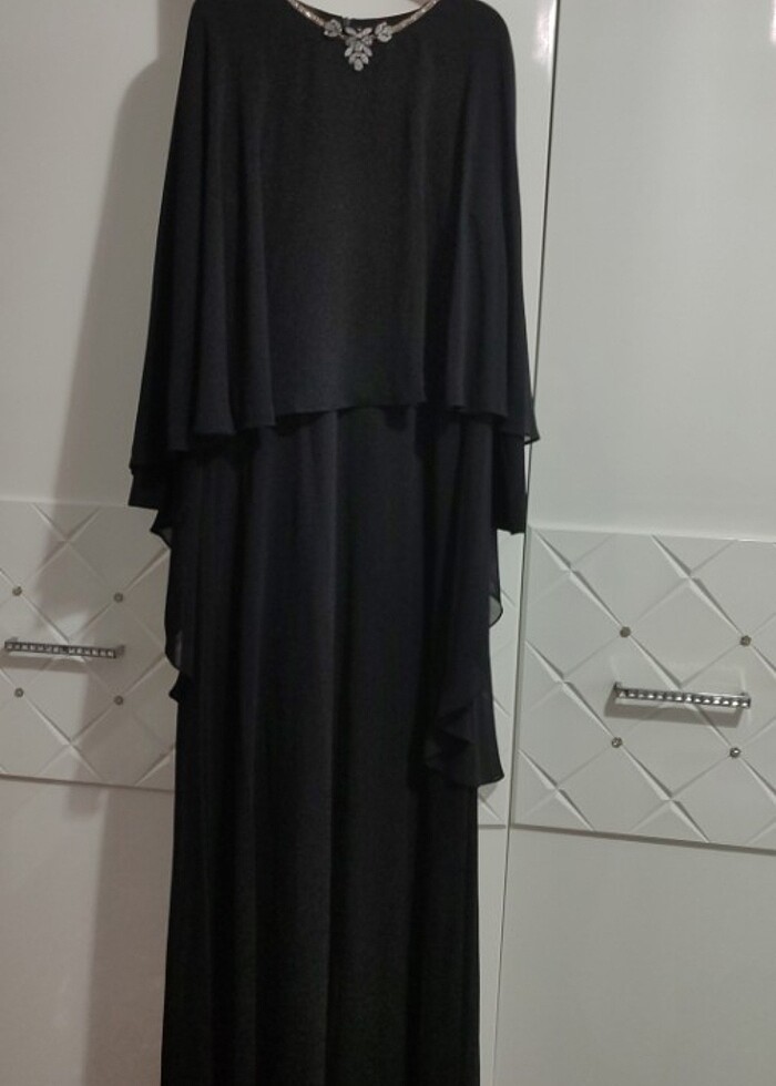 Markası armine iki kez düğünde giydim.üzerinde 42 beden yazıyor ama ben 44-46 bedende giydim. İyi durumdadır. İçi Sandy kumaş dışı şifon dur. Etek bölümünde de şifon vardır. Üstü pelerinlidir. Önü kısa arkası uzundur hiç hatları belli etmez.