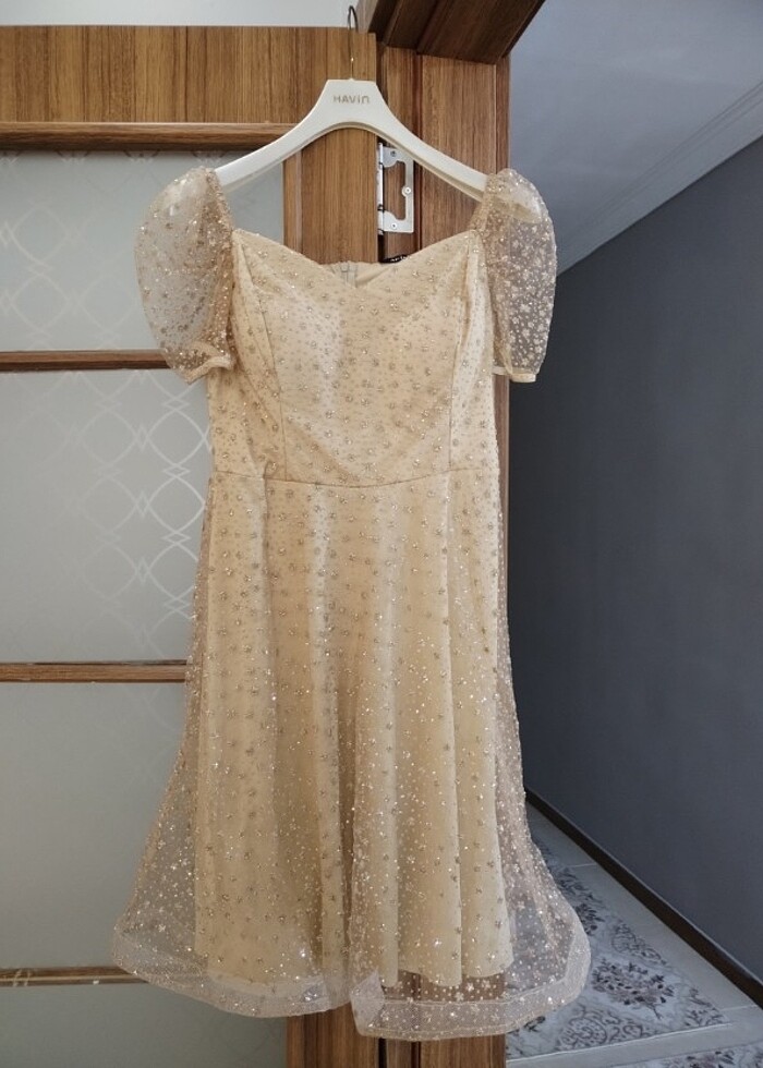Temiz hiçbir sorunu olmayan bir abiye. Sadece 1 kere abimin düğününde giyindim üstünde xl beden yazıyor ancak terzide s yaptım .