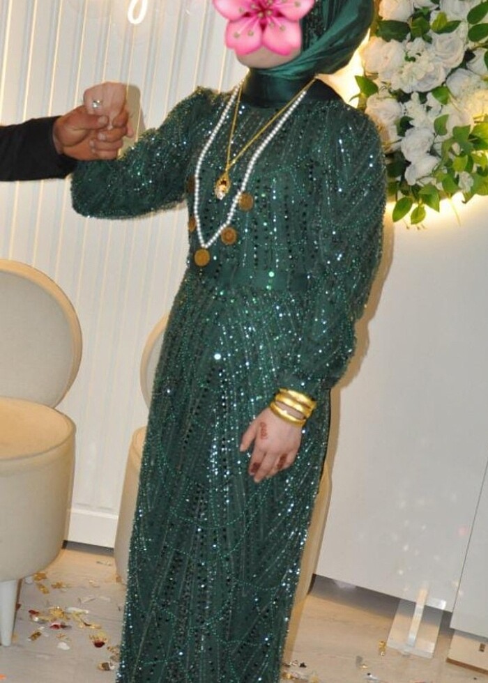 Kardeşimin söz elbisesi. Bir kere giyildi. Zümrüt yeşili rengindedir. Yırtık sökük yoktur. Marka temsilidir.