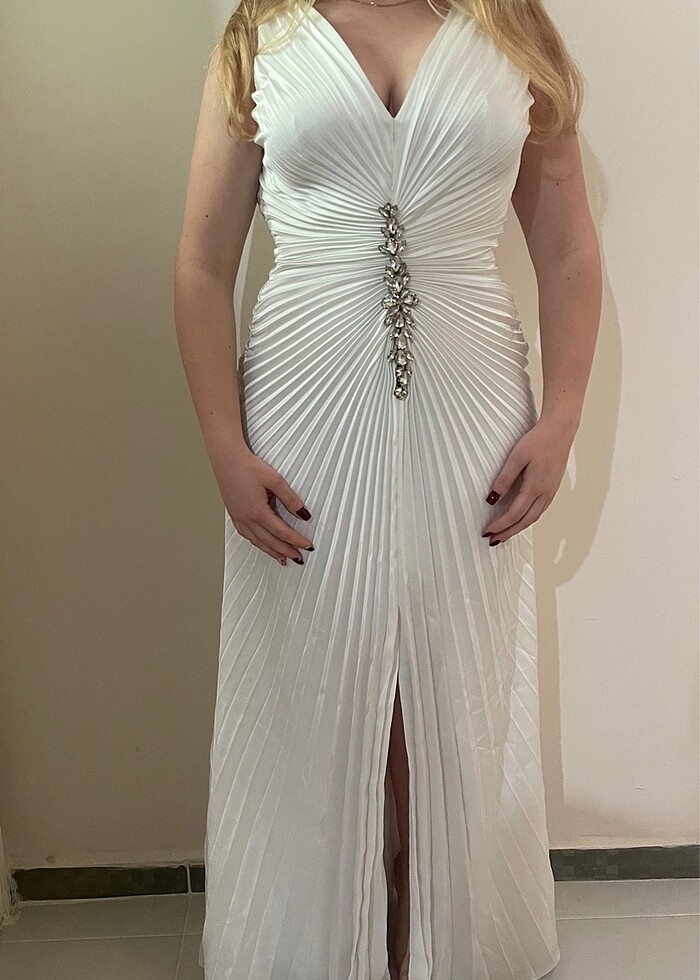 Düğün nişan kız isteme beyaz abiye uzun , göğüs taş dekolte, önden bacak dekolte. Arkadan fermuarlı Bir kez giyildi kız isteme de , çok güzel kaliteli kumaşı var. Alacak olanı mutlu edeceğine eminim. Hayırlı olsun şimdiden