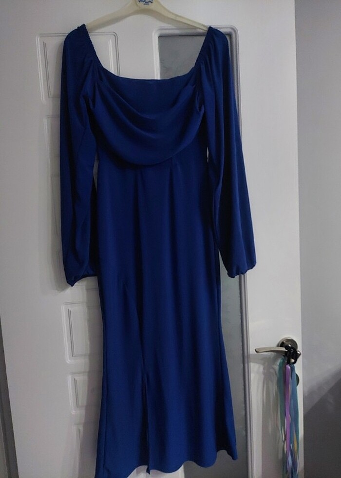 Sifır ürün hiç kullanilmadi Bagcikli kismi arka kismi Hafif balik model Yirtmaci mevcut kucuk bir yirtmac Midi boy Saks mavisi ince kumas lastikli kol abiye