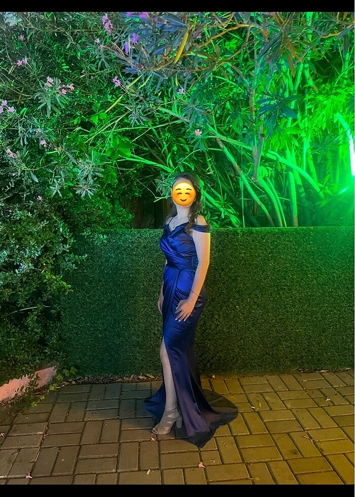 Kadın lacivert uzun hafif kuyruklu önden yırtmaçlı sadece 1 kere giyilmiş abiye hasarı yok fermuarı düzgün ince ip askılı l beden ☺️
