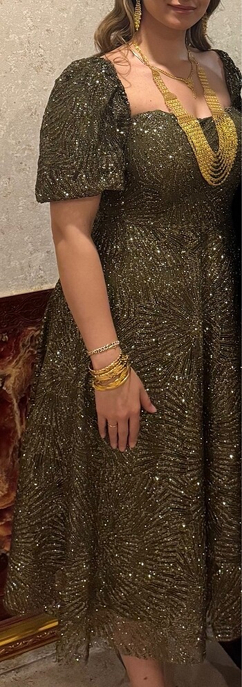Parıltılı balon kol volanlı midi boy haki renk astarlı toparlayıcı özelliği mevcut sadece 1 kere 3 saat giyildi hiç bir hasarı kusuru yok