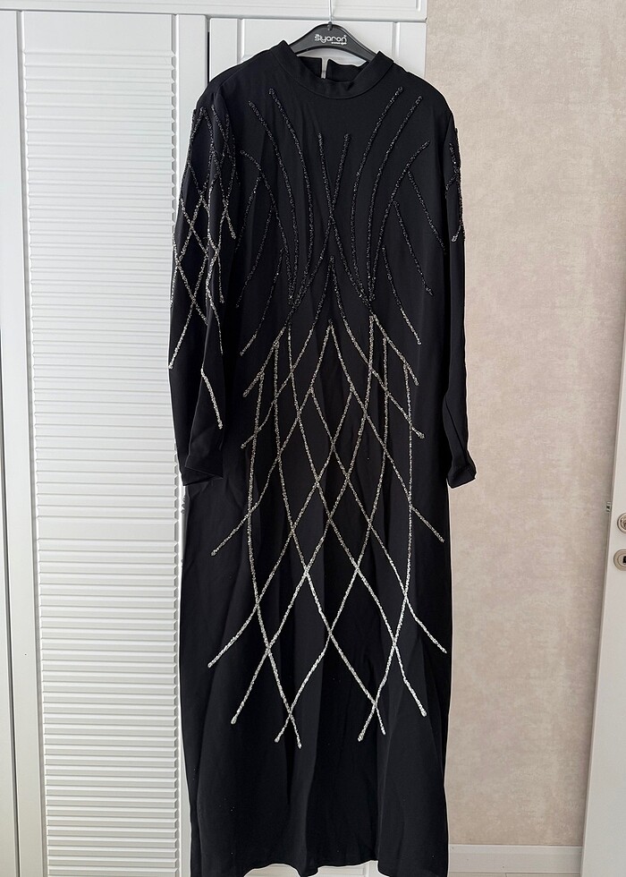 Bir kere giyildi gri işlemeli siyah abiye 42 bedene uyumludur
