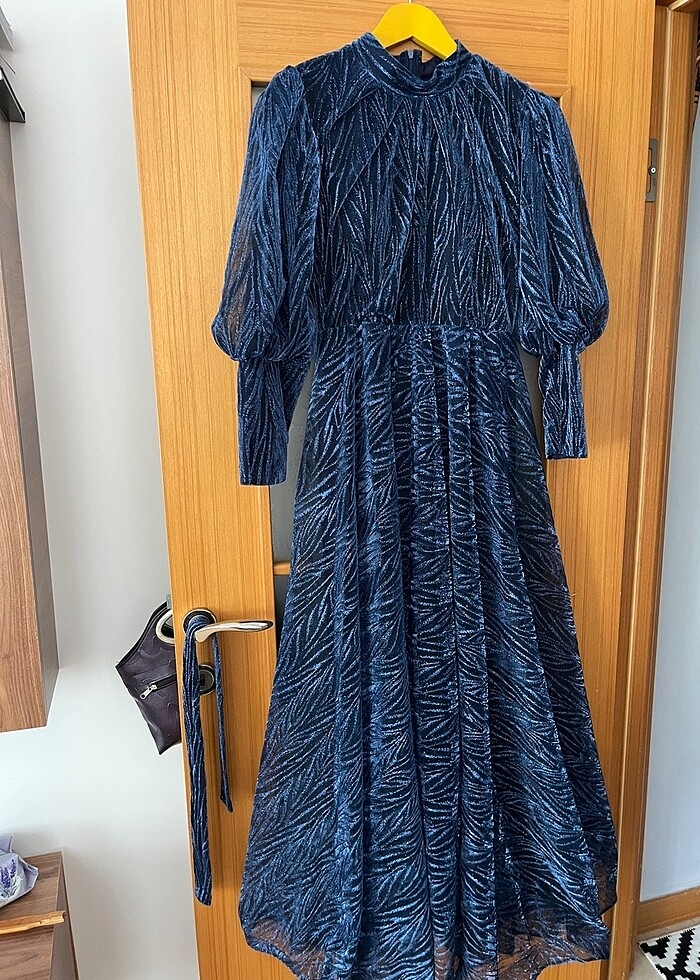 Lacivert simli abiye,bir kere giyildi,hiçbir sıkıntısı yok Kemeri var Göğüs pedi var 40-42 beden