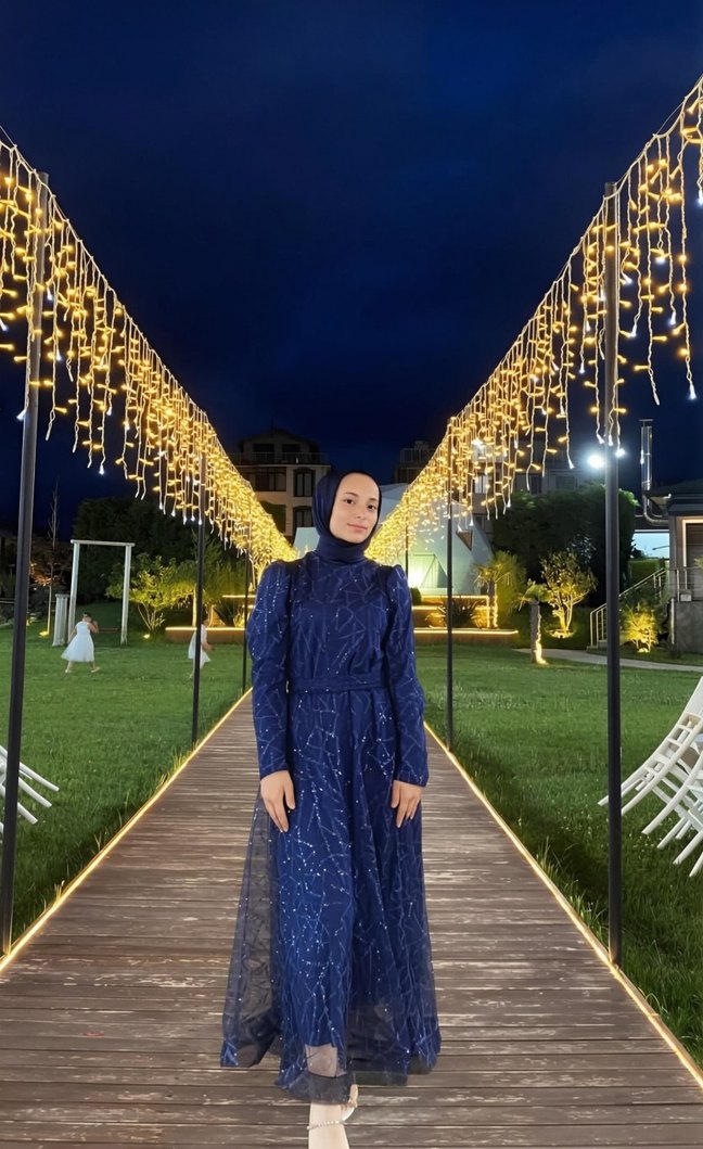Uzun kollu, yüksek yakalı lacivert abiye elbise. M beden defosuzdur. Yalnızca bir defa giyildi