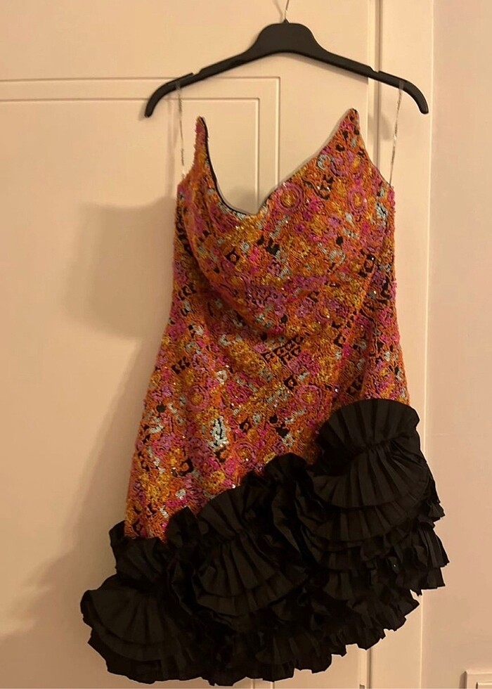 Pembe/Turuncu payetli, etek kısmı siyah fırfır detaylı, 38/40 beden uyumlu, 1 kere kullanıldı