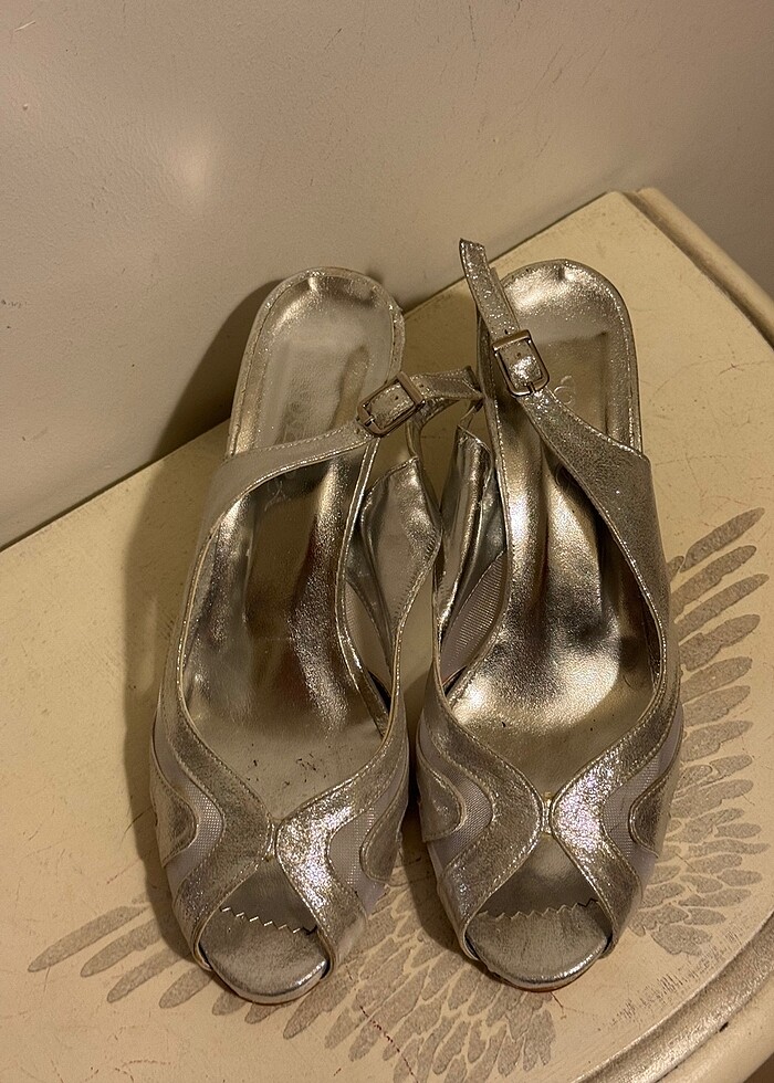 Silver renk metalik bir ayakkabı. Ablamın lise mezuniyetinde giydiği bir ayakkabıymış yani sadece 1 kez giyildi. Markasını bilmiyorum Vera marka yazıyor üstünde. Ankara-Karumdan alınmış. Sanırım kişiye özel tasarlanıyor yani başka kimsede yok. Altında öyle yazıyor.