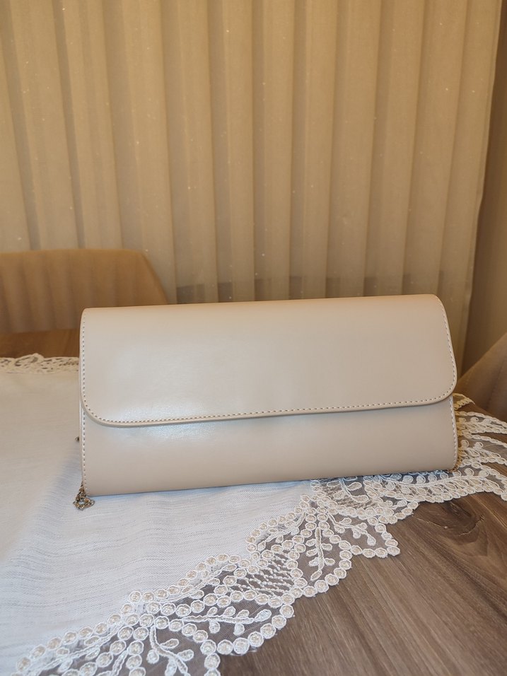 Bej deri, kemerli tasarıma sahip kadın el çantası. Düz yüzeyi ve modern klasik stili günlük kullanım için uygundur.