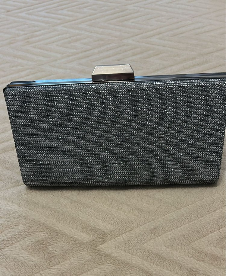 Gri renkte, tokalı ve desen içermeyen sentetik kumaştan yapılmış kadın clutch çanta. Ofis kullanımı ve klasik zarafet için uygundur.