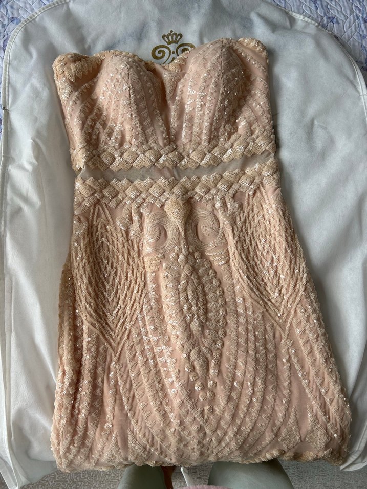 Dantel işlemeli, straplez ve vücuda oturan bu uzun elbise, pastel bej tonunda bohem tarzı yansıtarak düğünler için uygundur. 36-38 beden
