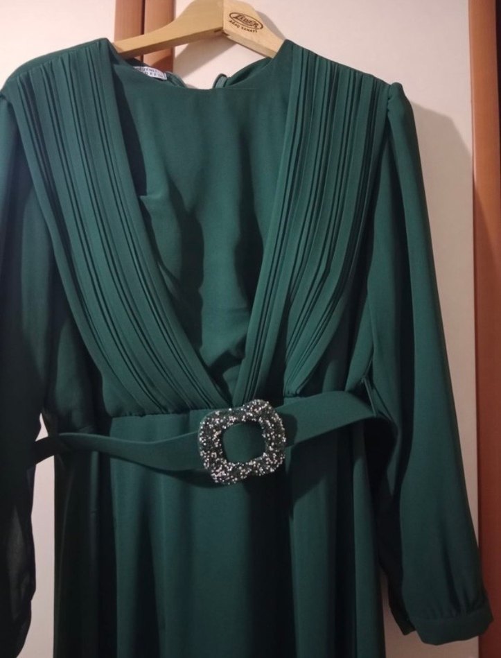 Kemerli uzun zümrüt yeşili abiye elbise, uzun kollu tasarıma sahiptir.. hiç bir sorunu yoktur