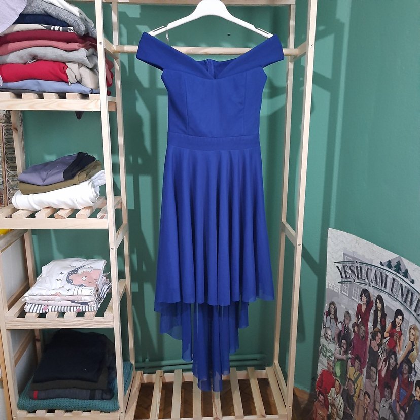 Mavi straplez, kayık yaka, önü kısa arkası uzun abiye elbise. Ön 80 cm, arka 120 cm, şifon, astarlı, göğüs kısmı süngerli, eteği tül