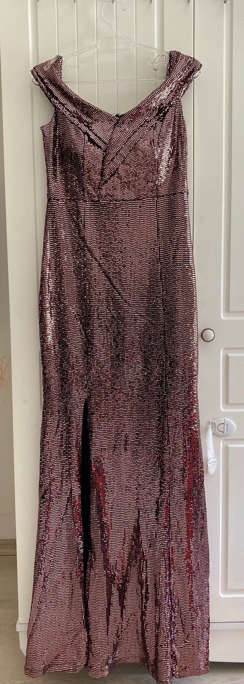 V yaka drapeli ve yılan desenli bakır payetli uzun abiye elbise oturan kısımı kolsuz yapısıyla önden yırtmaçlı M ve L bedenleri mevcut