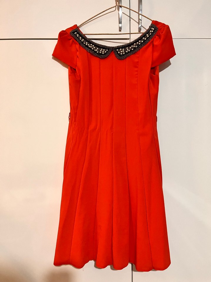 Etiketinde 40 yazsa da 38e uygun. Rengi fotoda çok canlı çıkmış, aslında biraz daha açık ve daha mat. Kusuru yok. Astarlıdır. Yakası inci detaylı, şık bir elbise. Marka temsilidir.