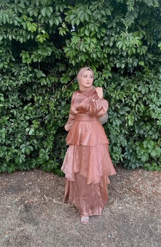 Uzun, dökümlü katmanları ve yüksek yakasıyla rahat, bohem tarzda bej renkli kadın elbisesi. Düğünler için uygun şık tasarım.