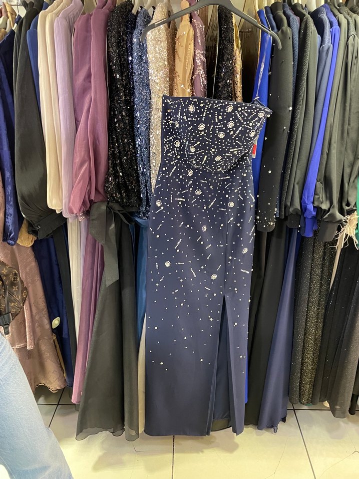 Lacivert, straplez, yırtmaçlı uzun abiye elbise. Hiç kullanmadım mükemmel sarıyor vücudu 34-36 uyumludur