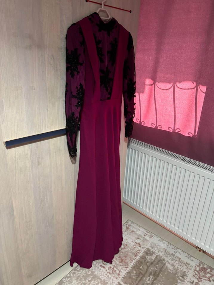Bordo, uzun kollu, işlemeli detaylara sahip, v yaka, klasik şıklık sunan dar kesim abiye elbise. Düğünler için uygun. 1 kez giyildi. Özel dikim