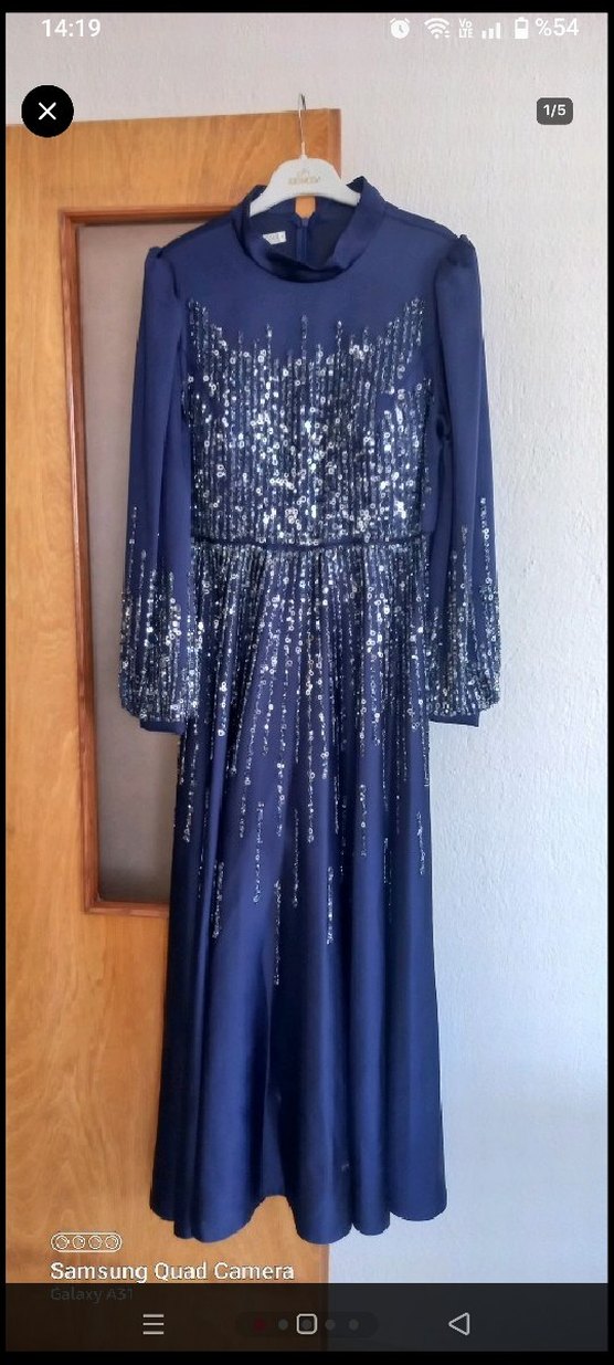 morcivert renk uzun abiye elbise, yüksek yakalı ve uzun kolludur. Parlak payetlerle bağlama boyası desenli, bol kesim ve çağdaş tarzda, düğünler için uygundur. ✨44 beden 1 kez giyildi uyumlu malı ile birlikte verilecwktir
