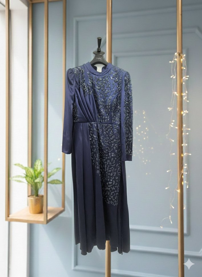 İNDİRİM VARDIR İSTEDİĞİNİZ FİYATI BELİRTİN YETER. Lacivert uzun abiye elbise, yüksek yakalı ve uzun kollu, nakışlı detaylara ve drapeli tasarıma sahiptir. Düğünler için uygundur.