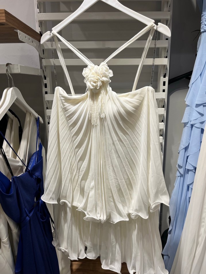 Bohem tarzda, askılı ve straplez yakalı beyaz gelinlik. Hafif kumaş, uzun ve bol kesimli, göğüste çiçek detaylı. 40/42/44 bedenler mevcuttur