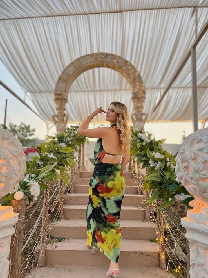vücuda oturan, drapeli tasarıma sahip, hafif çok renkli batik desenli sentetik kumaştan yapılmış uzun elbise, parti için uygundur. Üstünde hafif lekeler var ama model gibi gözüküyor.