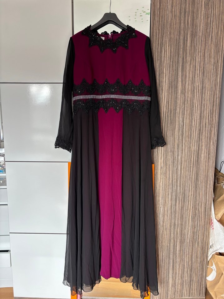 Yüksek yakalı, nakışlı detaylara sahip uzun, bol kesim elbise. Sentetik kumaştan, bordo ve siyah renklerde, drapeli, düğün için uygun. 56 beden