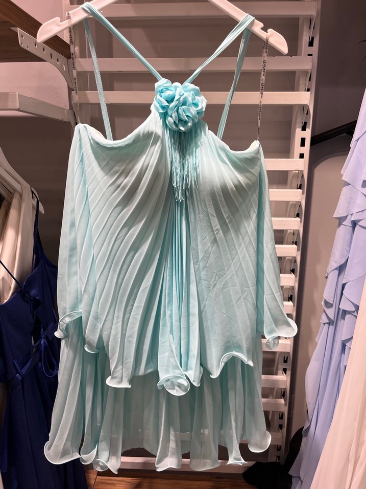 Bohem tarzda, askılı kolları ve straplez yakası olan uzun, bol kesim turkuaz elbise, parti için uygun. 38/40/42/44 bedenler mevcut