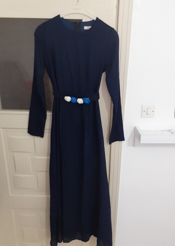 36 beden koyu lacivert ince çizgi detaylı bel kısmı kuşakli , keçeden cicek figürü vardır. Hiç giyilmemistir. Davetlere ve günlük kullanıma uygundur.
