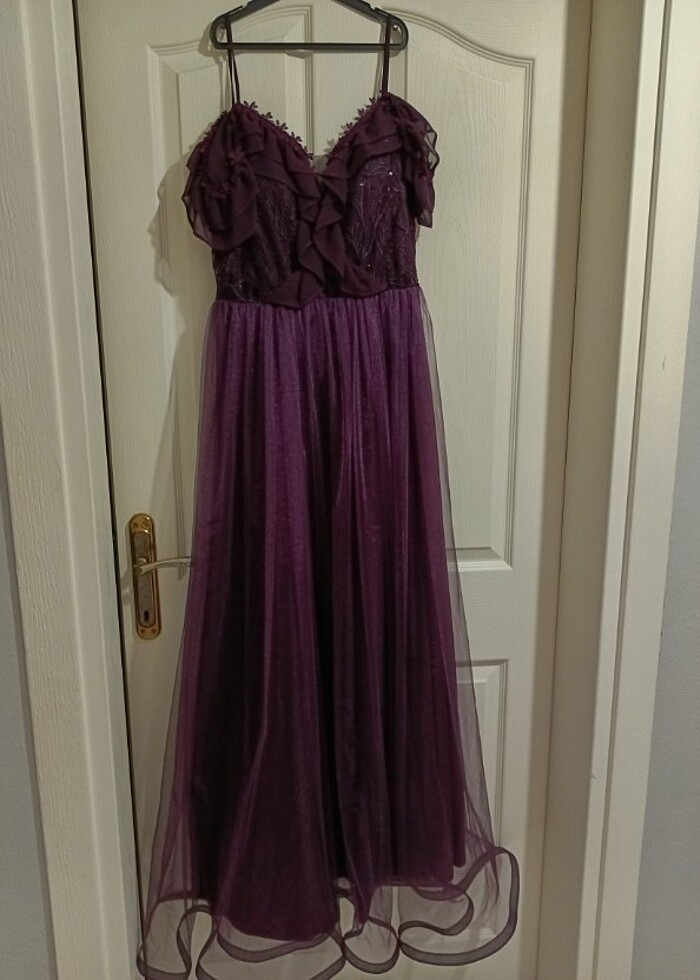 Sadece 1 kez giyildi. Hafif kusuru var etek kısmında. Kol altı boy 1.30 cm 10 cm topuklu ayakkabıyla giyildi.sifon fırfırlı abiye