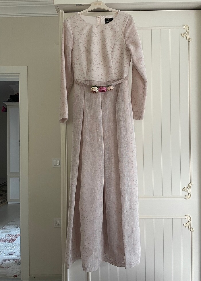 38 beden, açık pembe renkli, astarlı keten kumaş çok şık elbise. Duruşu çok kibar duruyor. Sadece 1 kere giyildi. Hiçbir deformasyonu yırtık sökük leke yoktur. Çok beğenerek almıştım ama Doğumdan sonra kilo aldığım için olmadığından satıyorum. Boyu 140 cm.