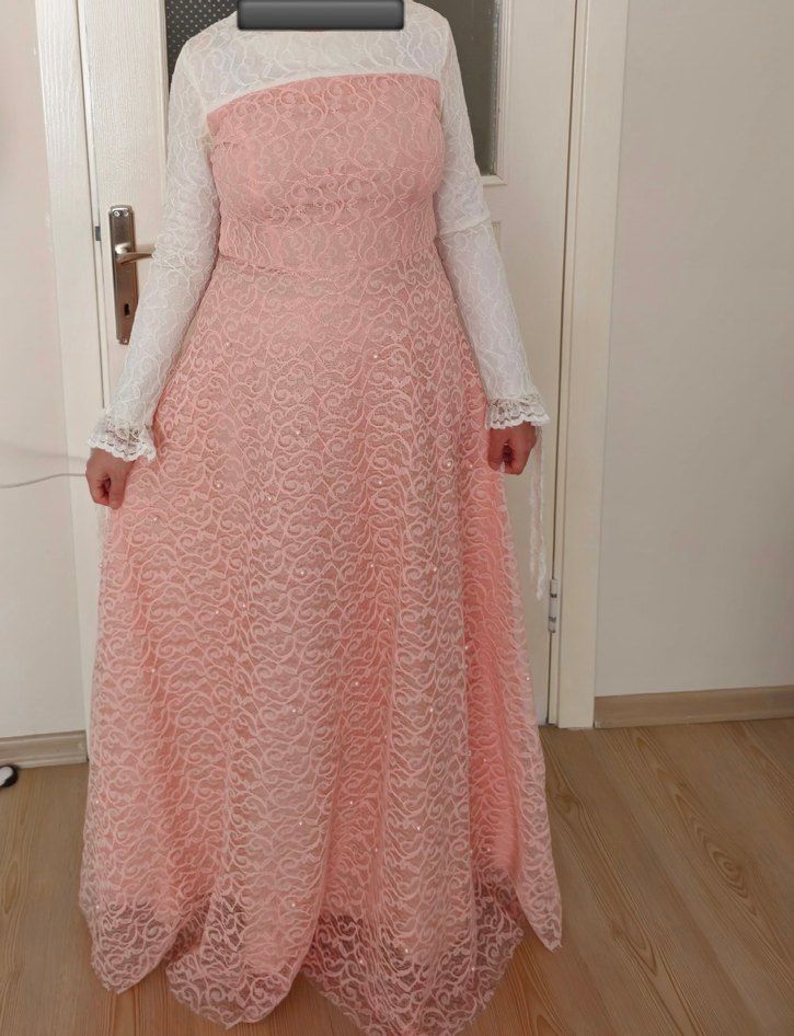 Uzun kollu, güpürlü, kolları dantel ve kemer detaylı, eteği incili yavruağzı rengi elbise. Ürün 36 beden olup 160 Boy 50 56 kilo ile uyumlu olur. Ürün sadece 1 kere giyilmiş olup iyi durumdadır.