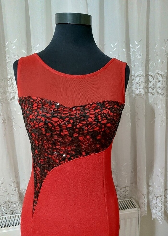 36 38 bedene uygundur.. esnek rahat bir kumaşı vardır... yaka bölümü tüldür... balık kesim elbisedir...