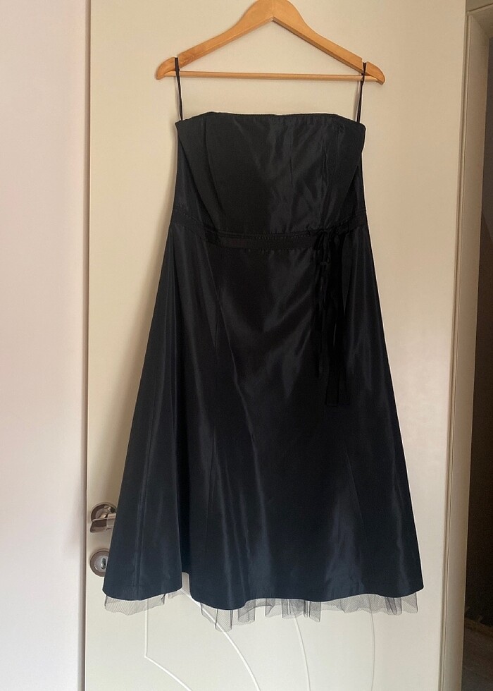 Abiye straptez, disi mat saten, gögüs altında çan şekline, iç etek ucundan görünen delikli tül, boydiz üstü.