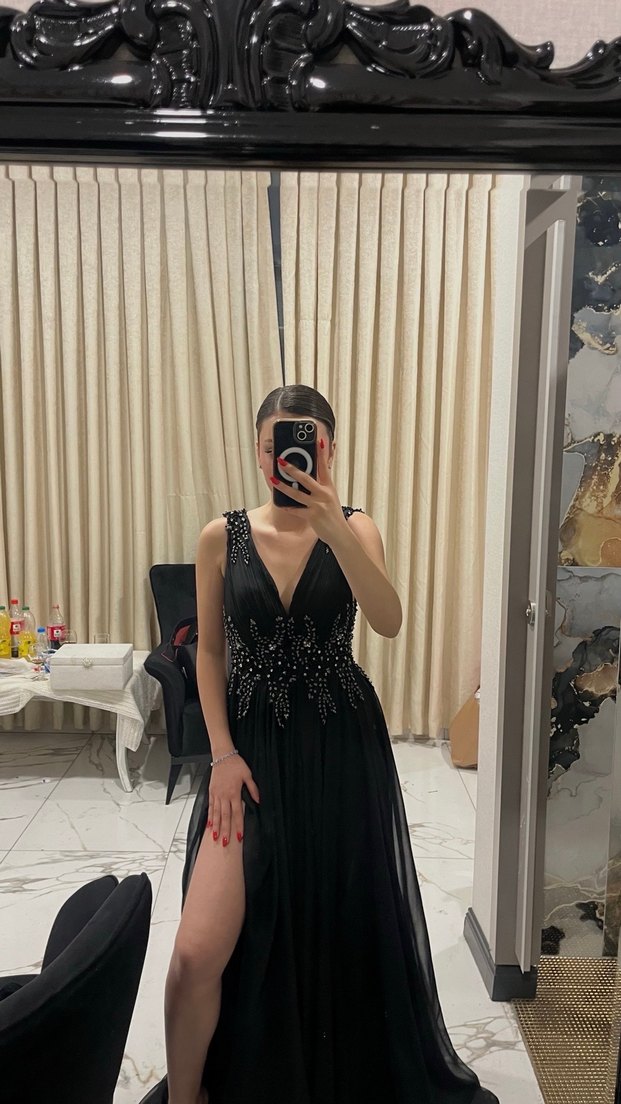 Bu siyah, v yaka ve kolsuz abiye elbise, payet detaylarıyla dikkat çekiyor. Midi boy ve yırtmaçlı, cesur ve göz alıcı bir tarz sunar.