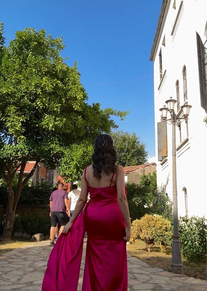 38 bedendir. 1 defa giyildi. İster straplez ister ip askılı olarak kullanabilirsiniz.