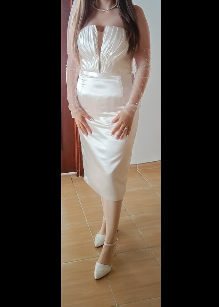Evden almada yarım saatliğine giydim, bir kereliğine kullanımdır ve özel dikimdir, 38-40 beden uyumludur, içi dikili astarlıdır, sateni kaliteli iç belli etmez gelinlik sateni gibidir, dikim fiyatı 8000 TL dir.