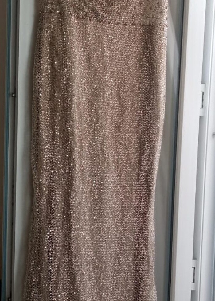 Elbise bir kez iki saat giyildi 44/46 bende uyumlu Arkadan fermuarlı olduğu için daha fazla kilo birine giyilebilir Ağır ve havalı bir abiye