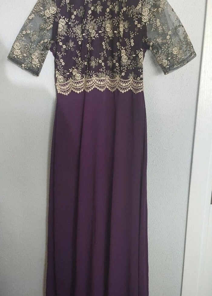 Şifon mürdüm - mor renkli bir elbise hiç giyilmedi. Üst kısmı güpür işlemeli hiç giyilmedi. Kolları yarım kol